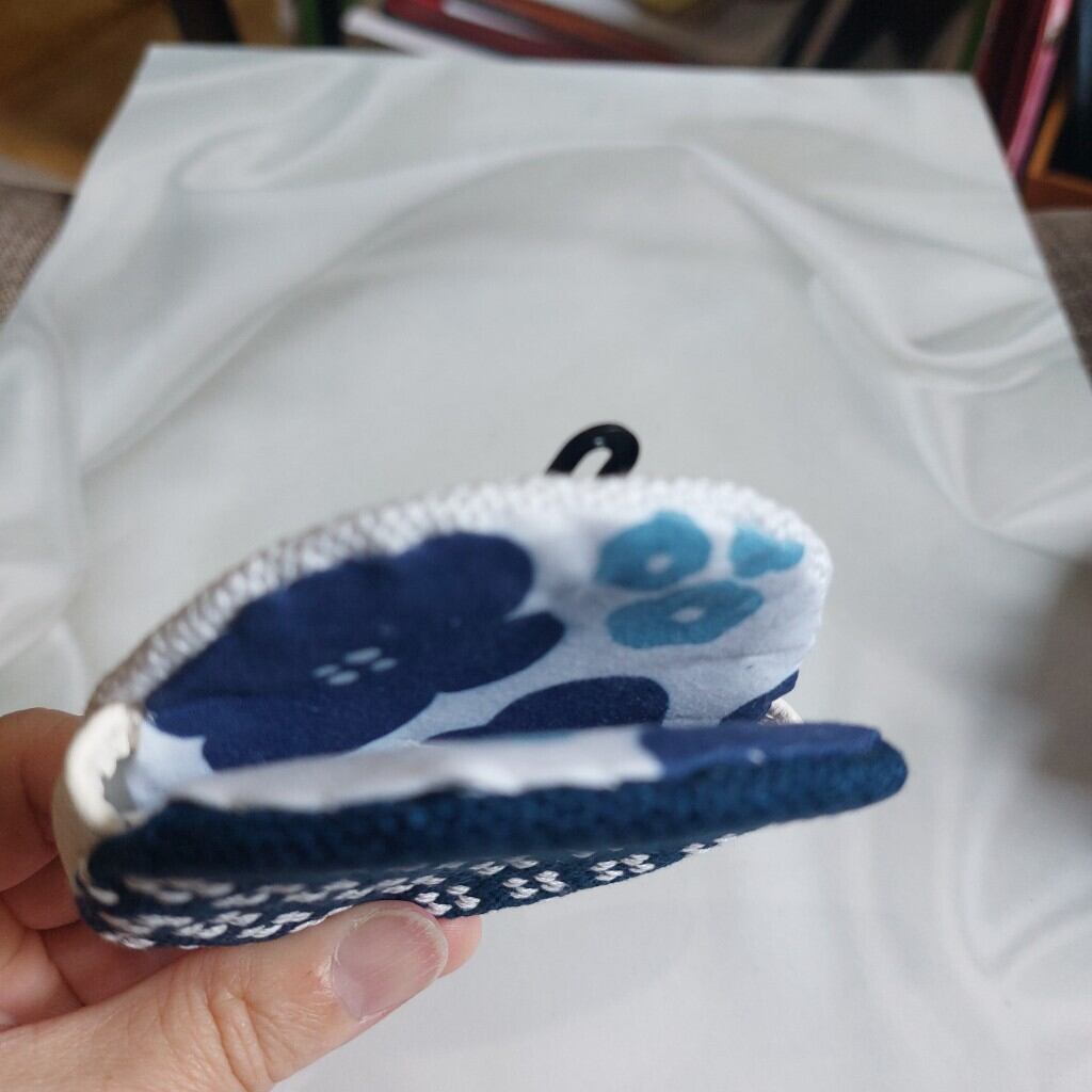 こぎん刺しの調子笛ケース。小花を散りばめたデザインです。内布には対照的な大柄の花柄布を使用。固めの芯やキルト綿を入れながら丁寧に手縫いをした調子笛にぴったりサイズのケースです。クリップは譜面台や着物着用時の帯などに挟めてとても便利です!