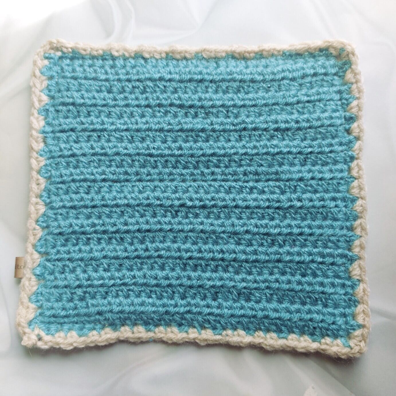 アクリル毛糸で編む洗剤いらずのエコ・タワシはアクリルの繊維の性質により、水なしでも洗浄力を発揮する魔法のたわし。「それなら三味線もピカピカになるはず!!」と四角に編みました。