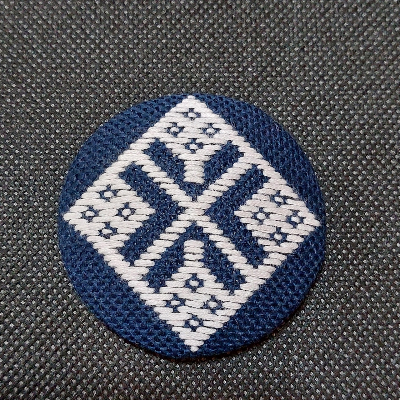 こぎん刺し飾りは紺地に白の糸で伝統柄の刺し子です。ビーズは青系の玉虫カラーが綺麗です。