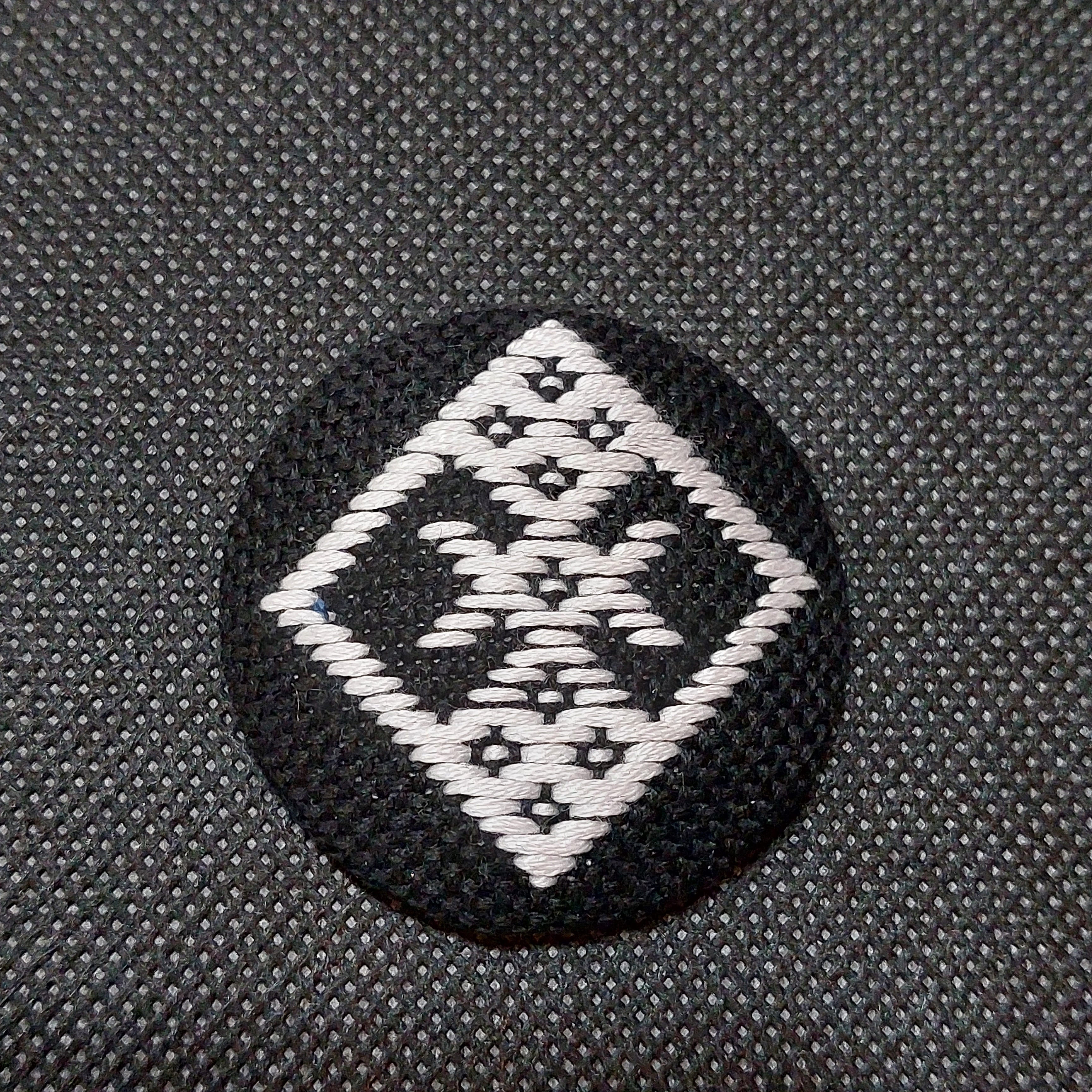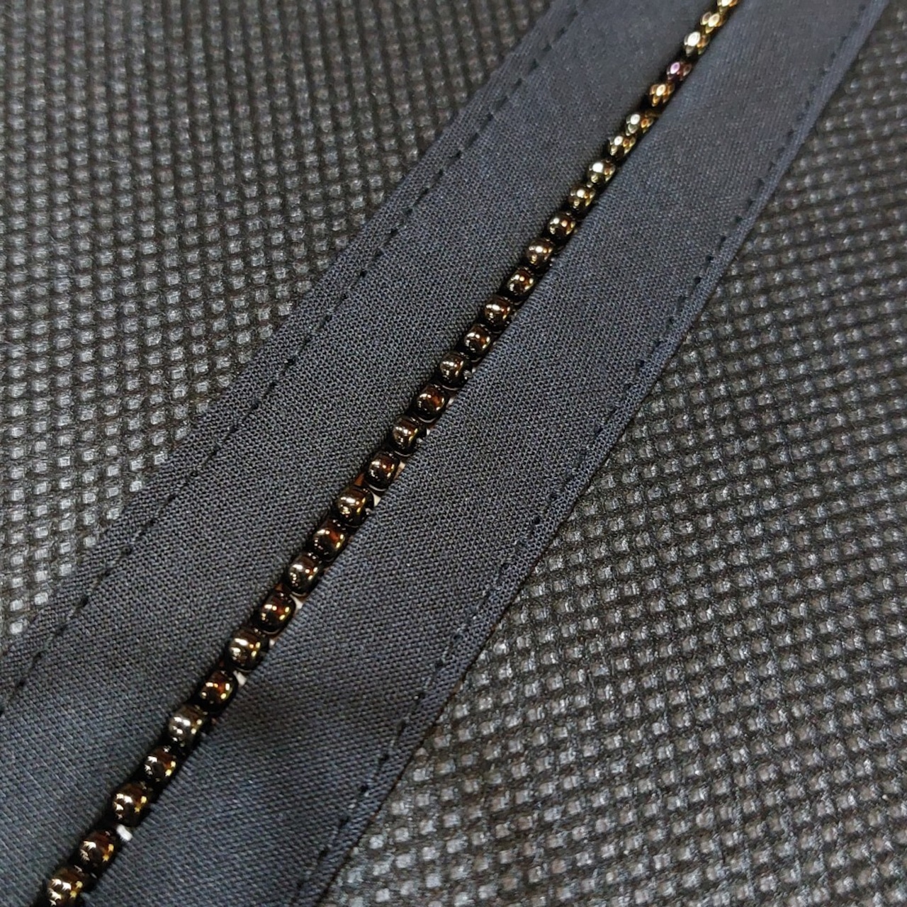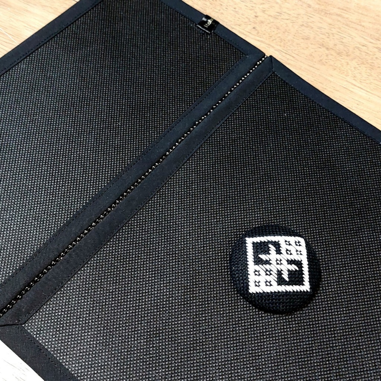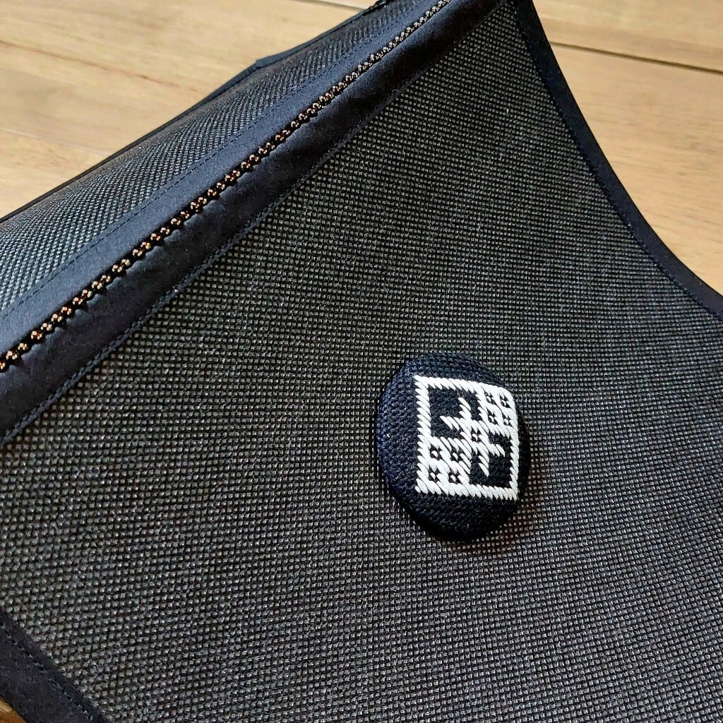 こぎん刺し飾りは黒地に白の糸で伝統柄の刺し子です。ビーズはブロンズ系玉虫カラーで渋い仕上がりです。