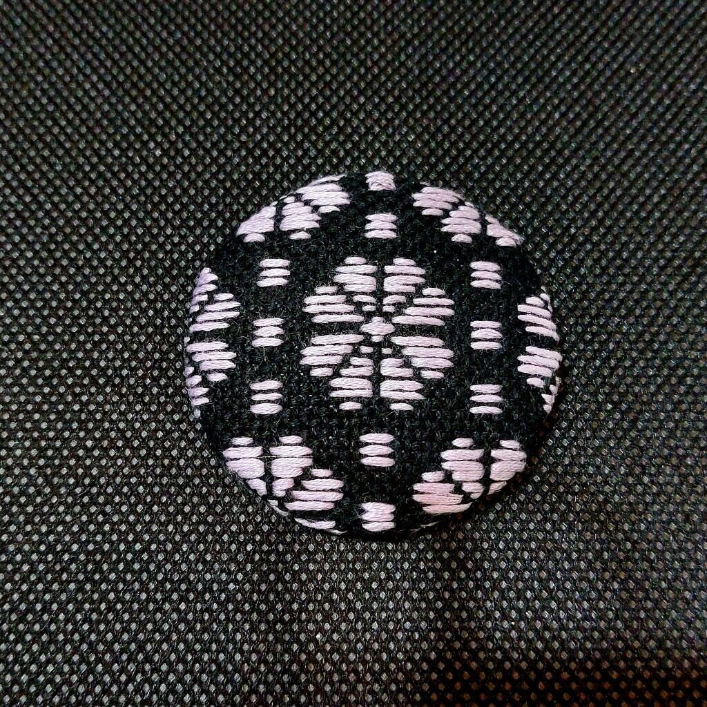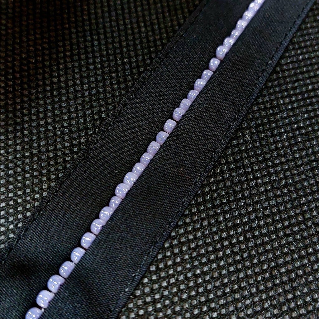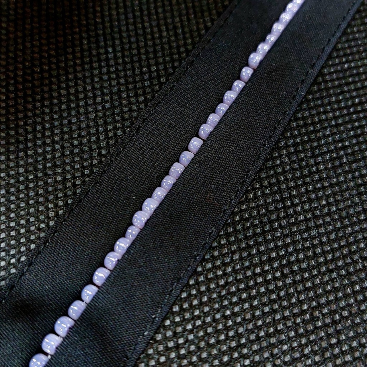 こぎん刺し飾りは黒地にスミレ色の糸で伝統柄の「梅の花」アレンジの刺し子です。ビーズもスミレ色系です。