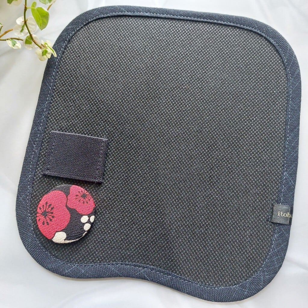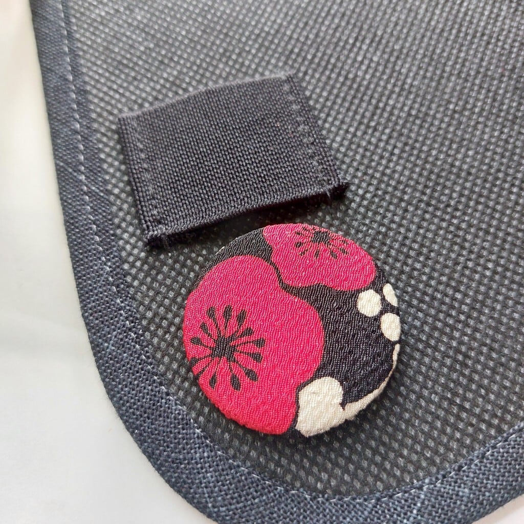 拘りの縁取りは、趣のある和布のバイアステープ。それに合わせ、落下防止のための飾りボタンを止めつけています。音緒部分は凹みをつけましたのでしっくりと収まります♪ 胴掛けのお色に合わせたり、お好みにぴったりなデザインで、ちょっとお洒落で便利な「お炭ちゃん」で楽しく湿気対策をどうぞ!