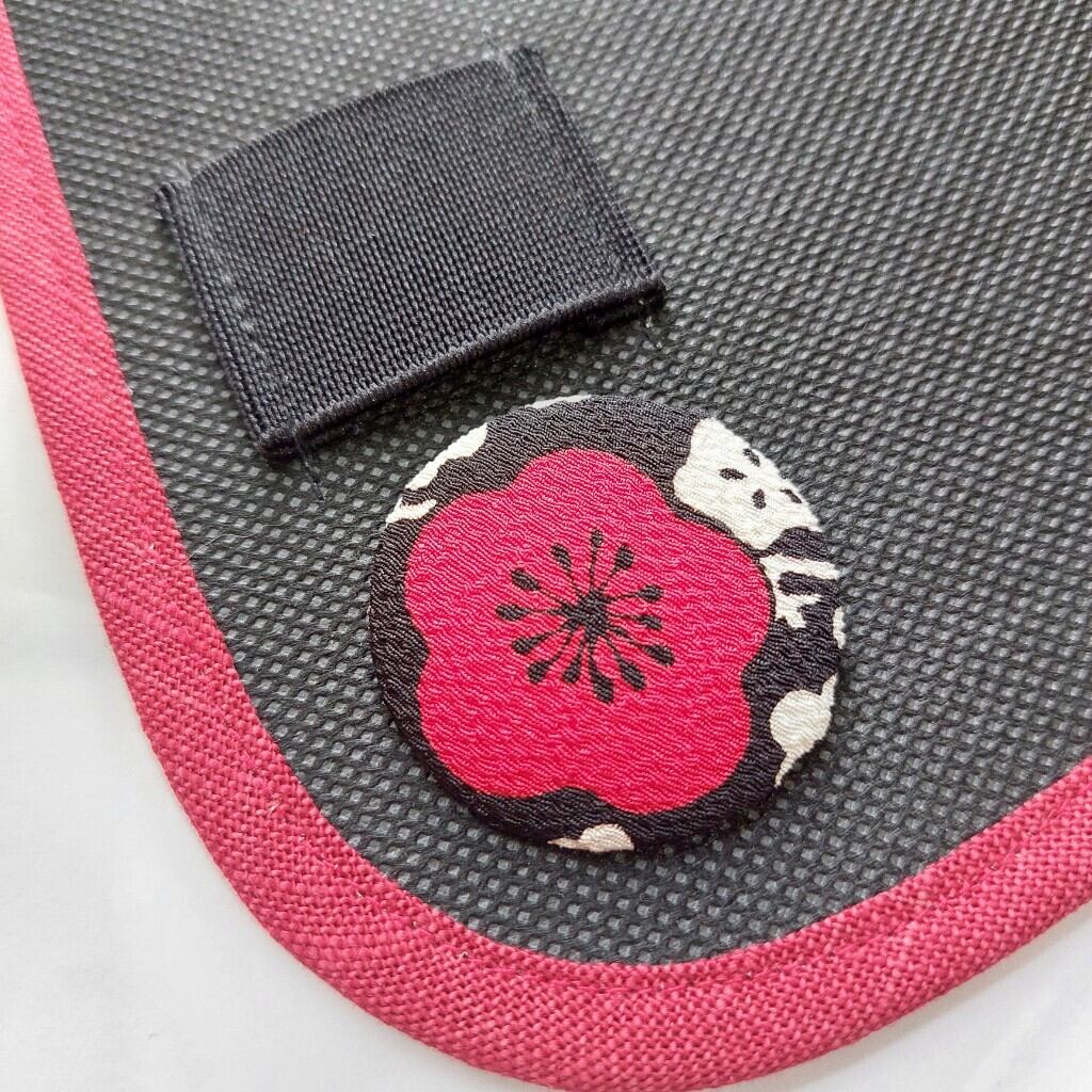 拘りの縁取りは、趣のある和布のバイアステープ。それに合わせ、落下防止のための飾りボタンを止めつけています。音緒部分は凹みをつけましたのでしっくりと収まります♪ 胴掛けのお色に合わせたり、お好みにぴったりなデザインで、ちょっとお洒落で便利な「お炭ちゃん」で楽しく湿気対策をどうぞ!