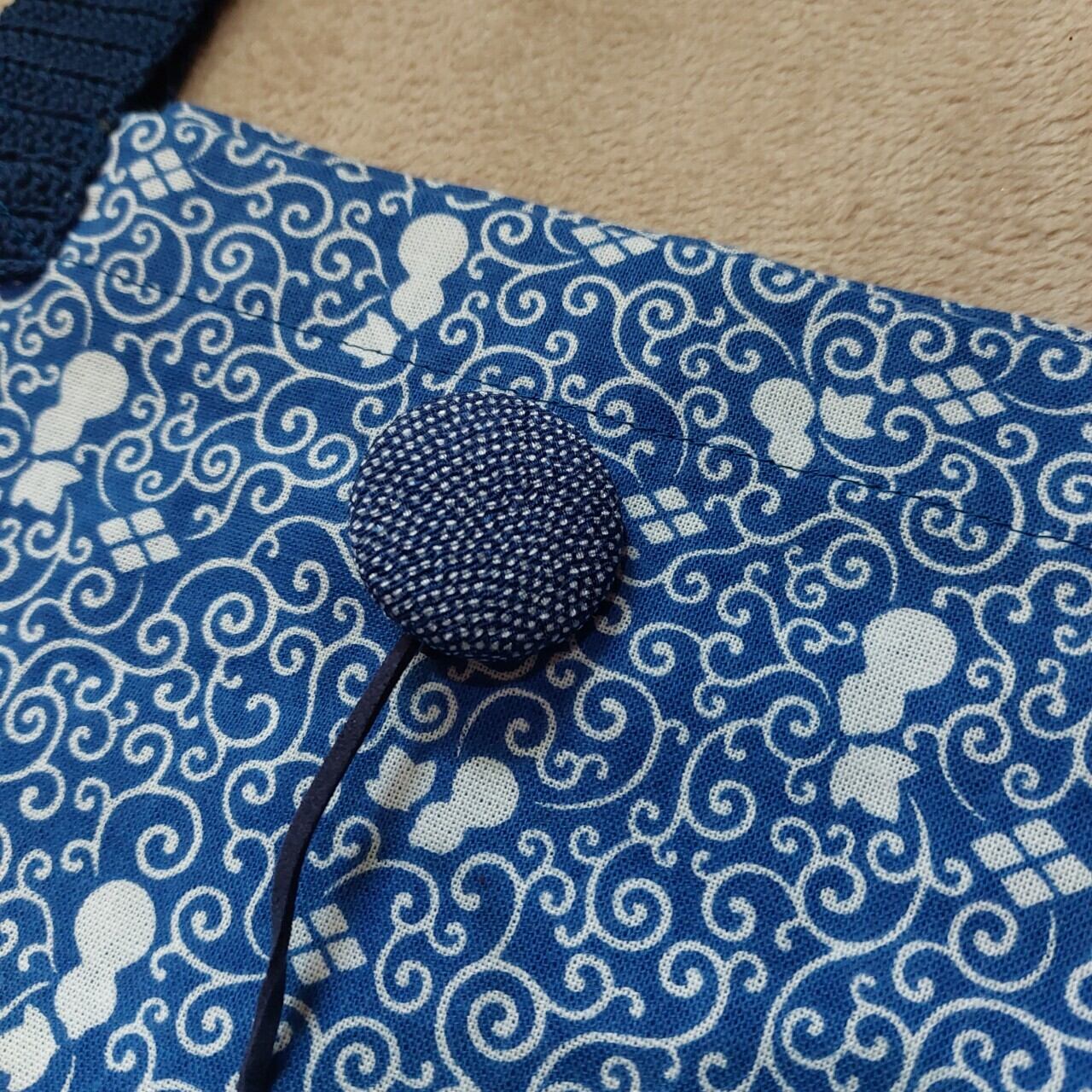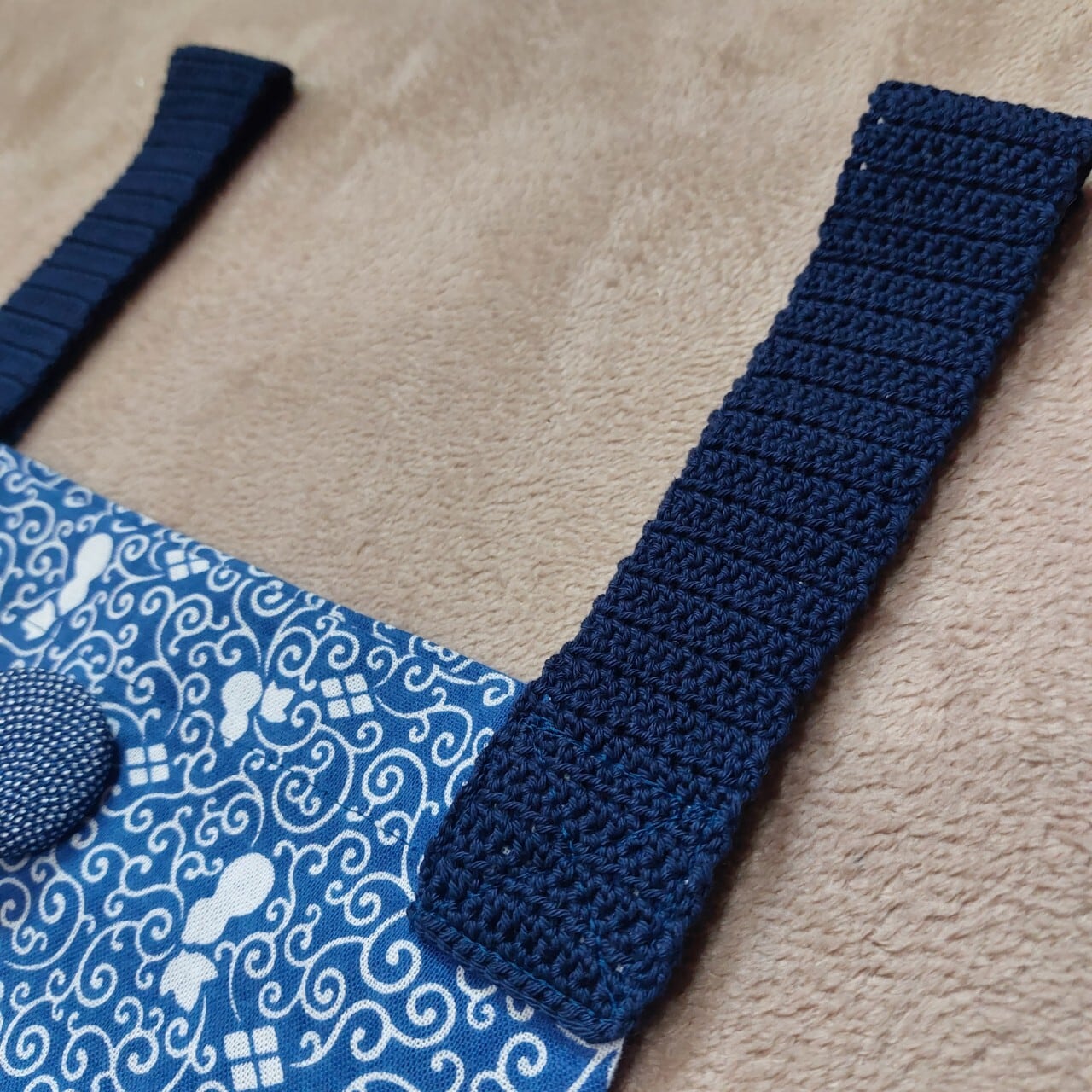 コットン糸で手編みした持ち手は、編む手間の分、手ぬぐいのぬくもりにぴったり。手に馴染む感触は手編みならではのソフトさなのに、重いものもタフに耐えてくれます!(作り手も愛用していての実感です^^)