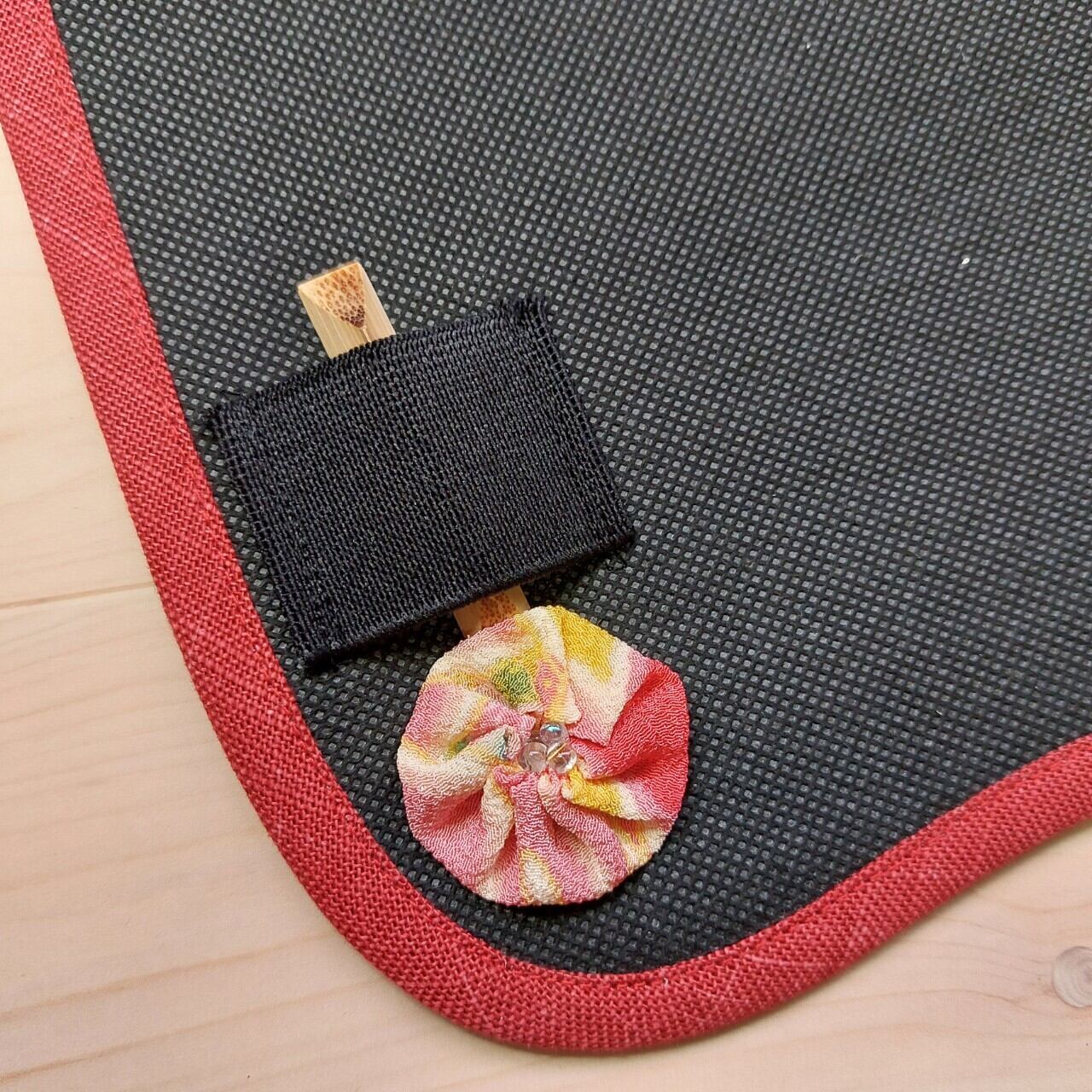 拘りの縁取りは、趣のある和布のバイアステープ。それに合わせ、落下防止のための飾りボタンを止めつけています。音緒部分は凹みをつけましたのでしっくりと収まります♪ 胴掛けのお色に合わせたり、お好みにぴったりなデザインで、ちょっとお洒落で便利な「お炭ちゃん」で楽しく湿気対策をどうぞ!