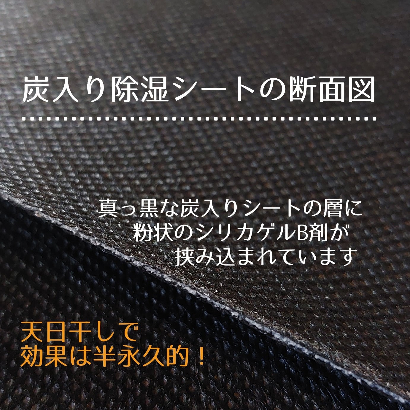 使用している黒い素材は、炭入りの除湿シート。シリカゲル剤が組み込まれている特殊シートです。炭とシリカゲルの作用で〈除湿〉に加え〈防カビ〉〈防臭〉効果も!!天日干しで半永久的に効果が持続します。湿度の低い晴れの日は是非数時間天日干しをして下さい♪