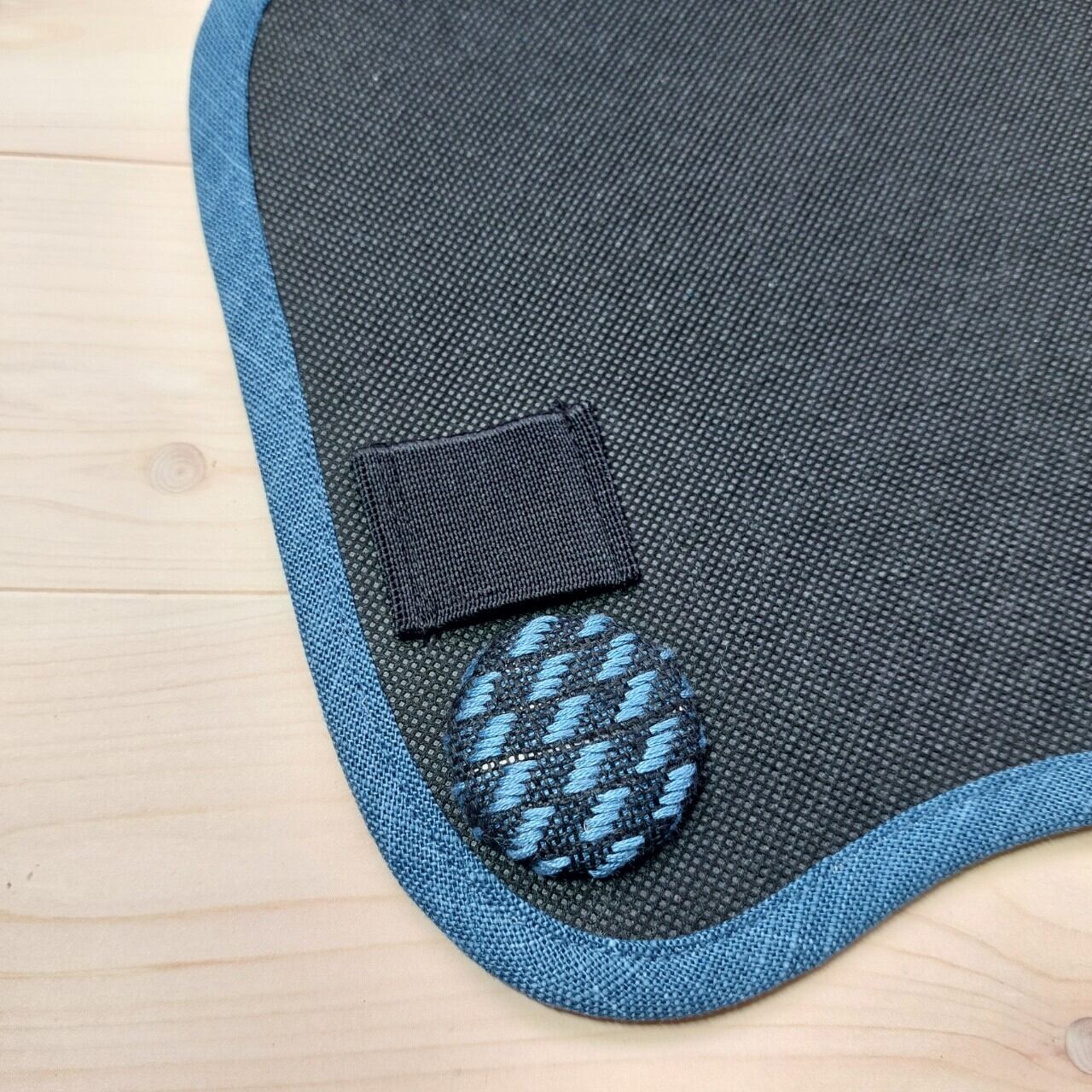 拘りの縁取りは、趣のある和布のバイアステープ。それに合わせ、落下防止のための飾りボタンを止めつけています。こちらはこぎん刺しの雪の結晶柄です❄ 音緒部分は凹みをつけましたのでしっくりと収まります♪ 胴掛けのお色に合わせたり、お好みにぴったりなデザインで、ちょっとお洒落で便利な「お炭ちゃん」で楽しく湿気対策をどうぞ!