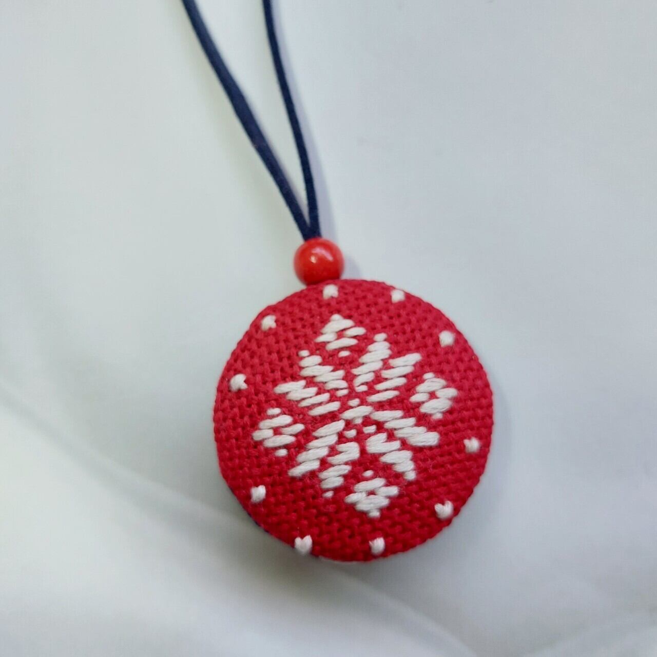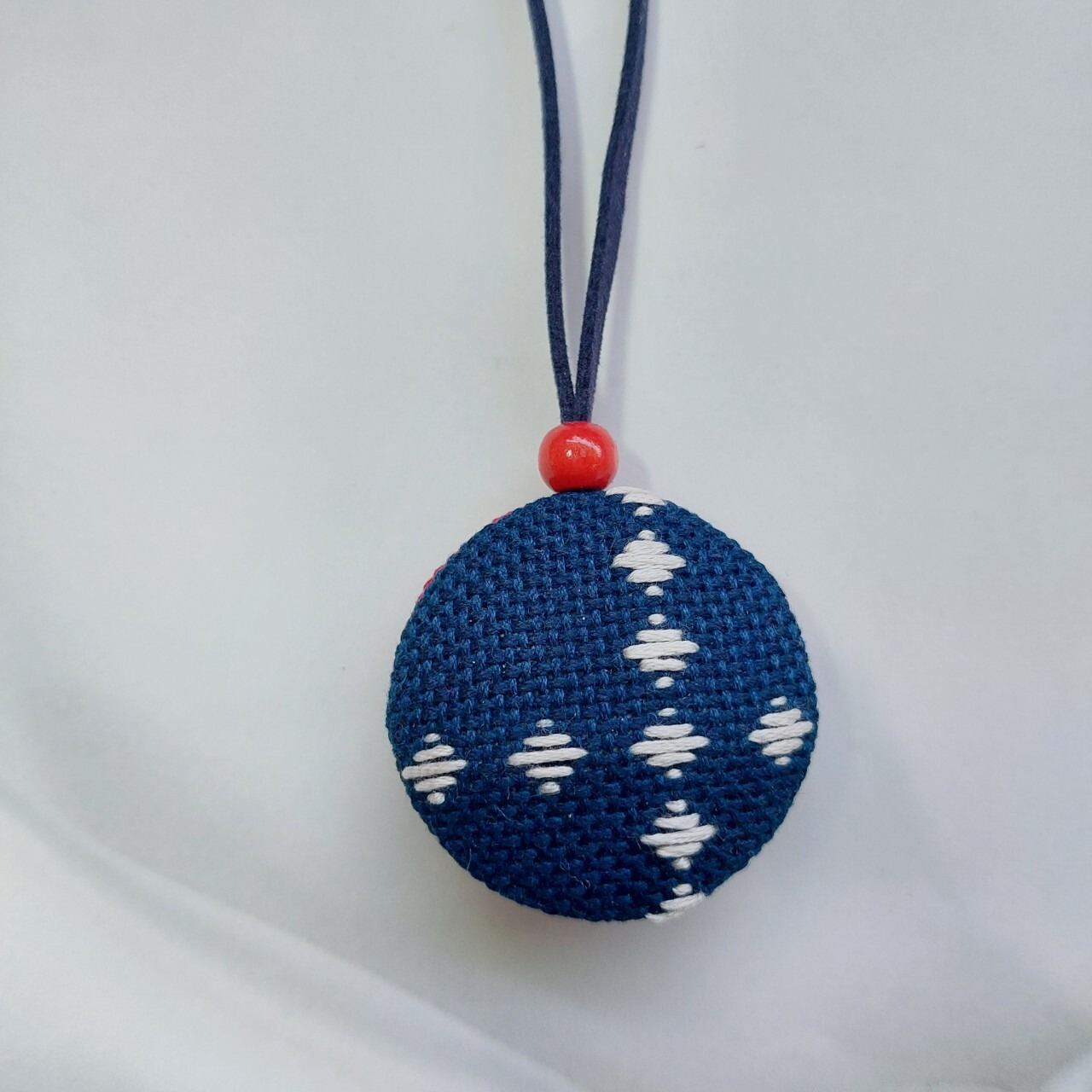 こぎん刺し:赤色地に白の糸・紺色地に白色の糸、直径約40ミリ