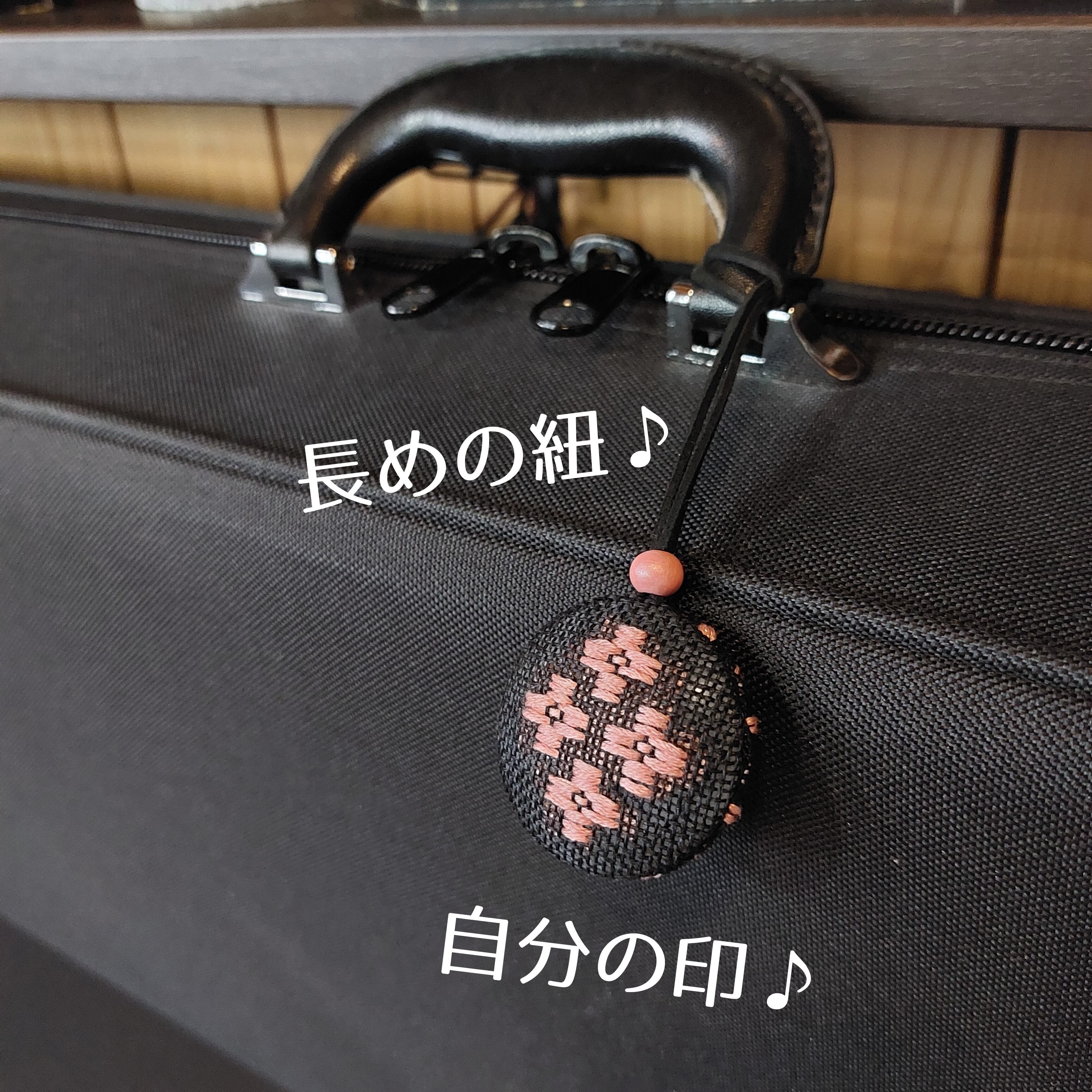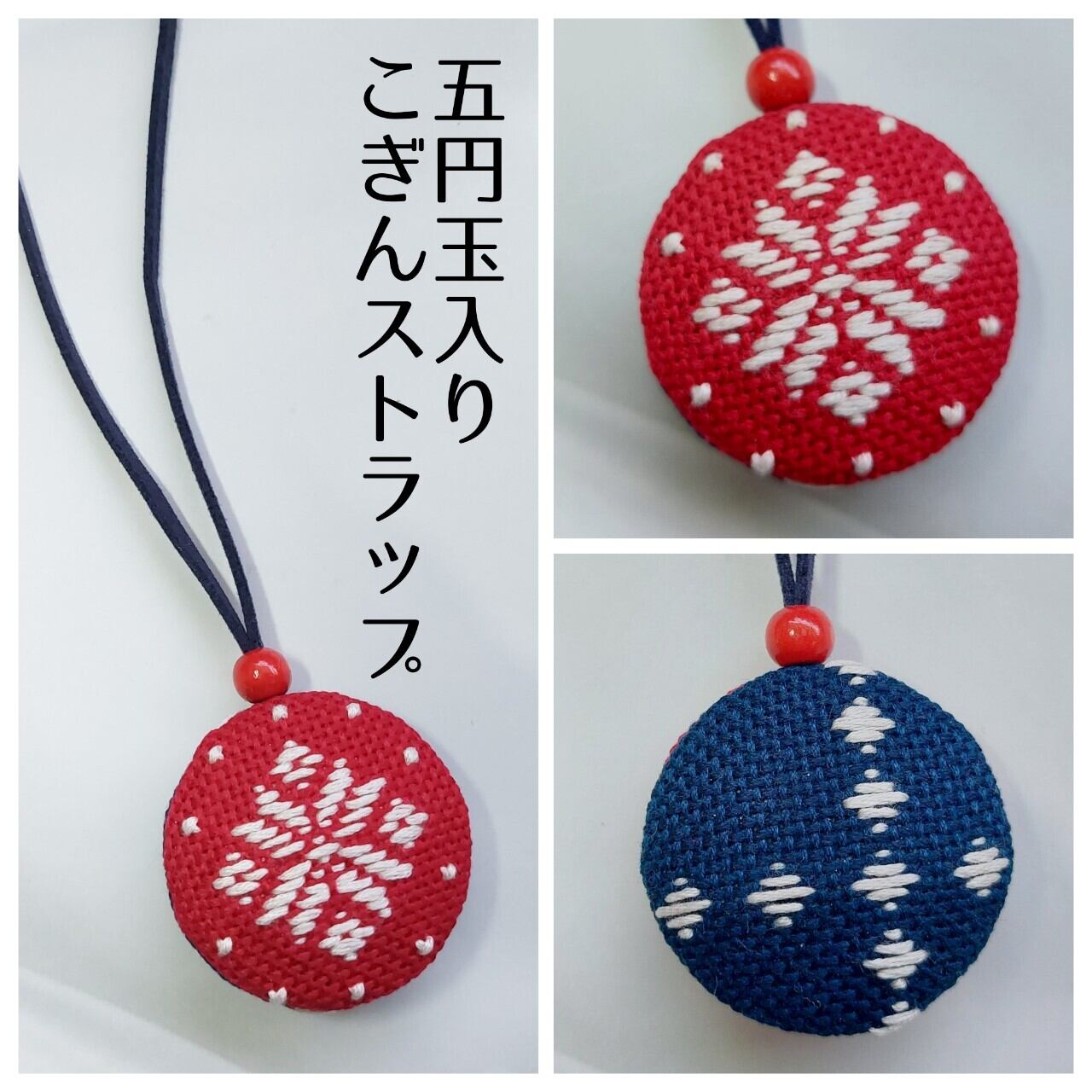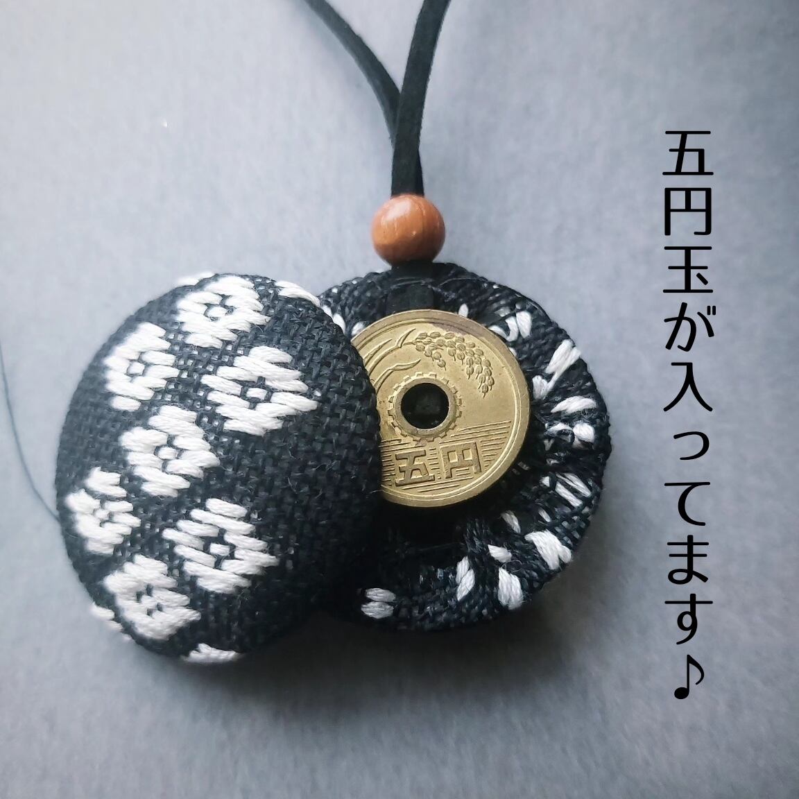 こぎん刺し2種の包みボタンを合わせ貝にし、御守りの五円玉を挟んで縫い閉じたストラップ。同じ色形が多い三味線ケースに、一目で分かるこぎん飾りを♪紐を長めにしているので、ゆとりを持って持ち手にくくれます♪