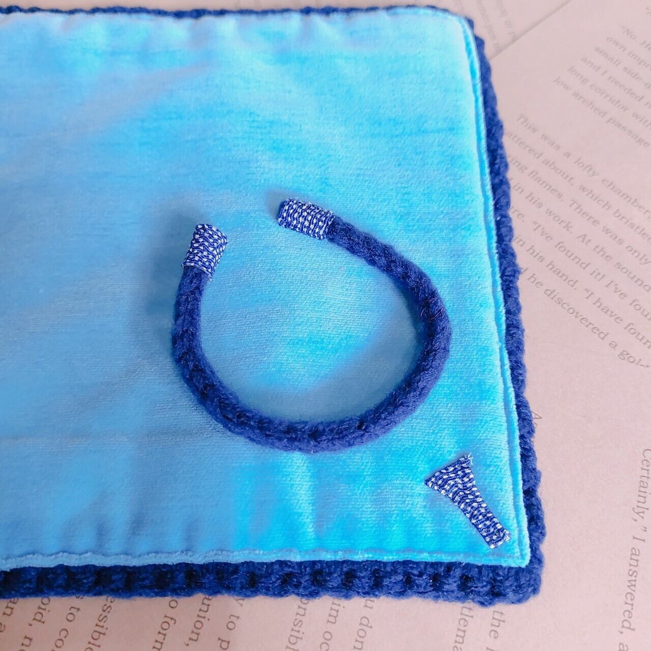 三味線も撥もピカピカに!お手入れクロス(リバーシブル:アクリル編地×ツヤ布巾)糸倉みがき紐付き【⑦紺×水色】