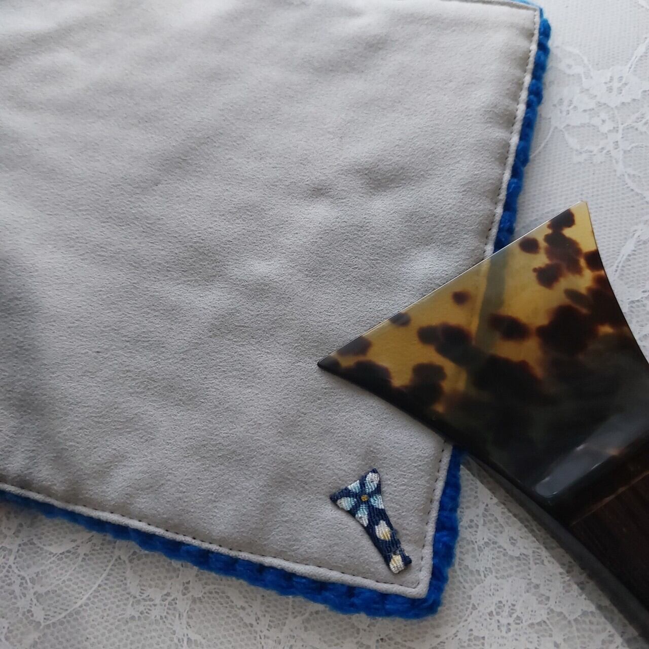 三味線も撥もピカピカに!お手入れクロス(リバーシブル:アクリル編地×ツヤ布巾)糸倉みがき紐付き【③青×グレー】