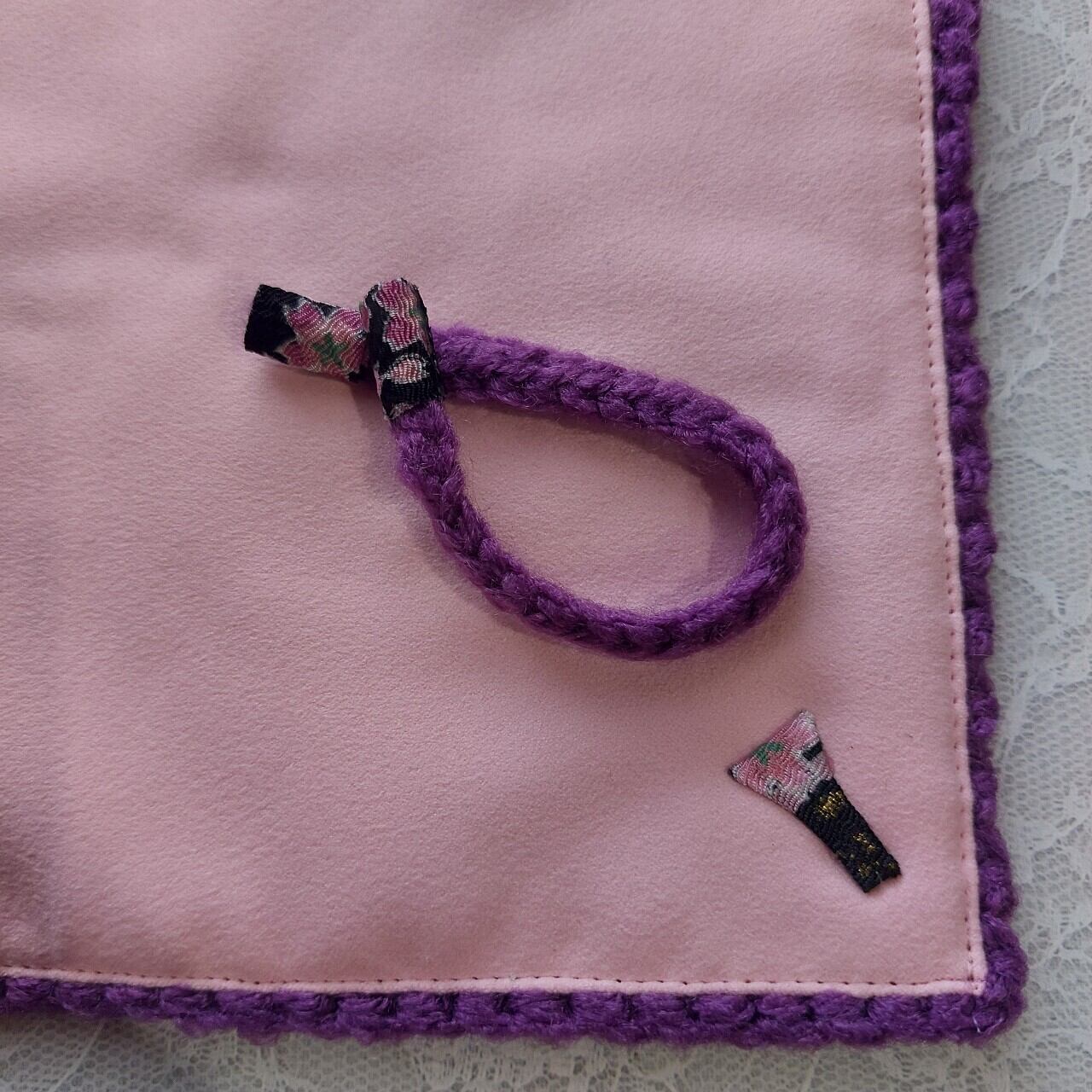 三味線も撥もピカピカに!お手入れクロス(リバーシブル:アクリル編地×ツヤ布巾)糸倉みがき紐付き【③パープル×桜色】