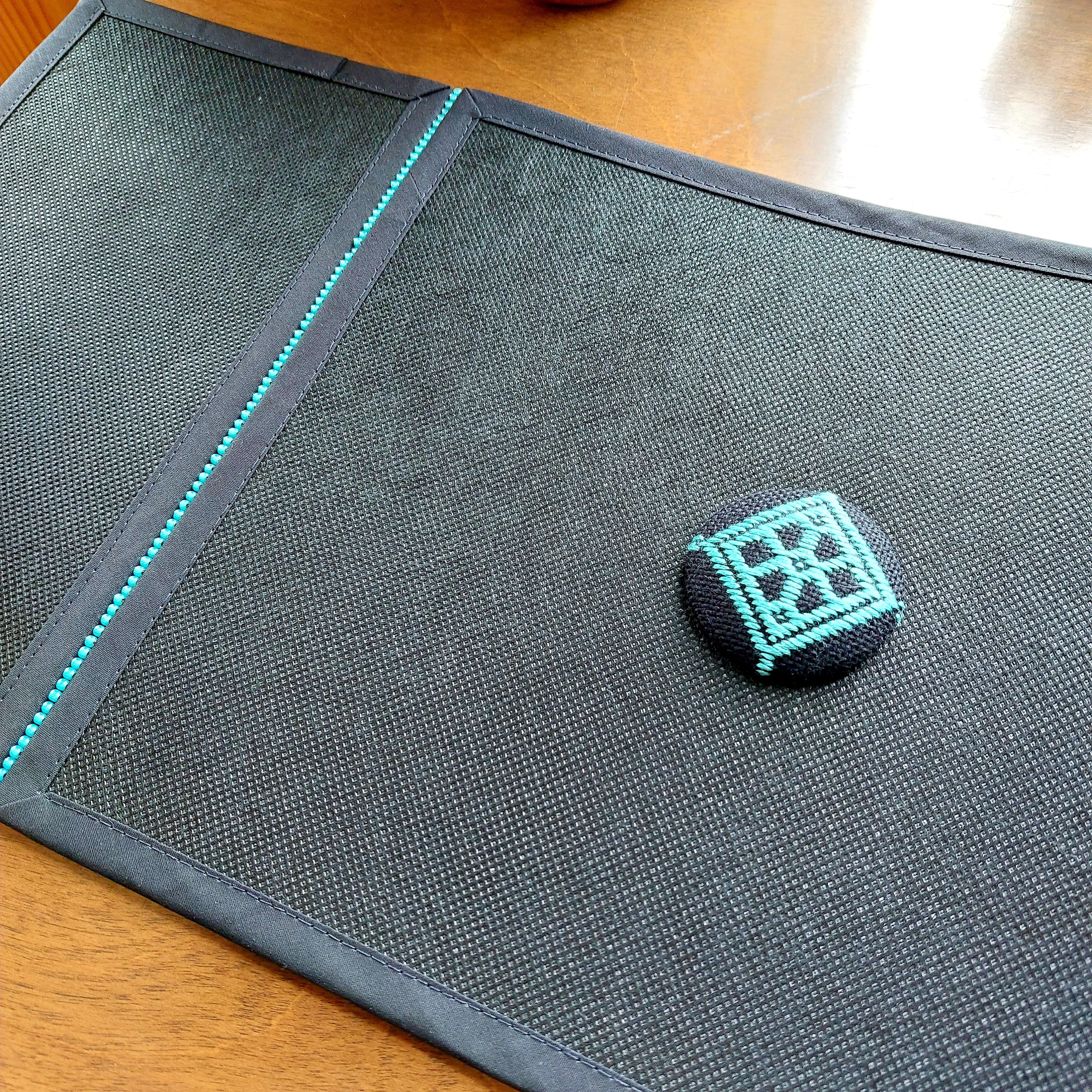 こぎん刺し飾りは黒地にエメラルド色糸で伝統柄「猫の足」アレンジの刺し子です。ビーズも綺麗なエメラルドカラーです。