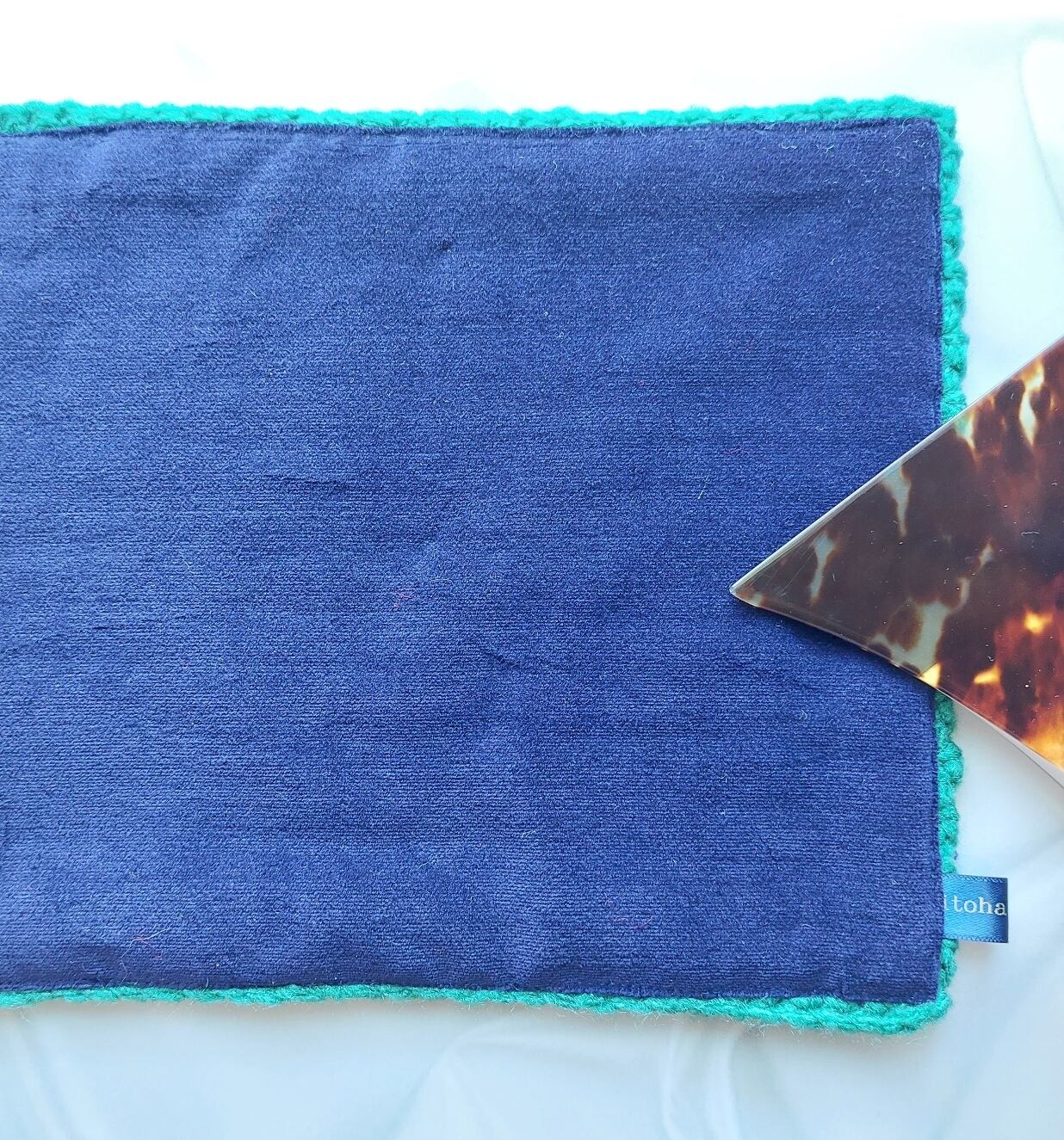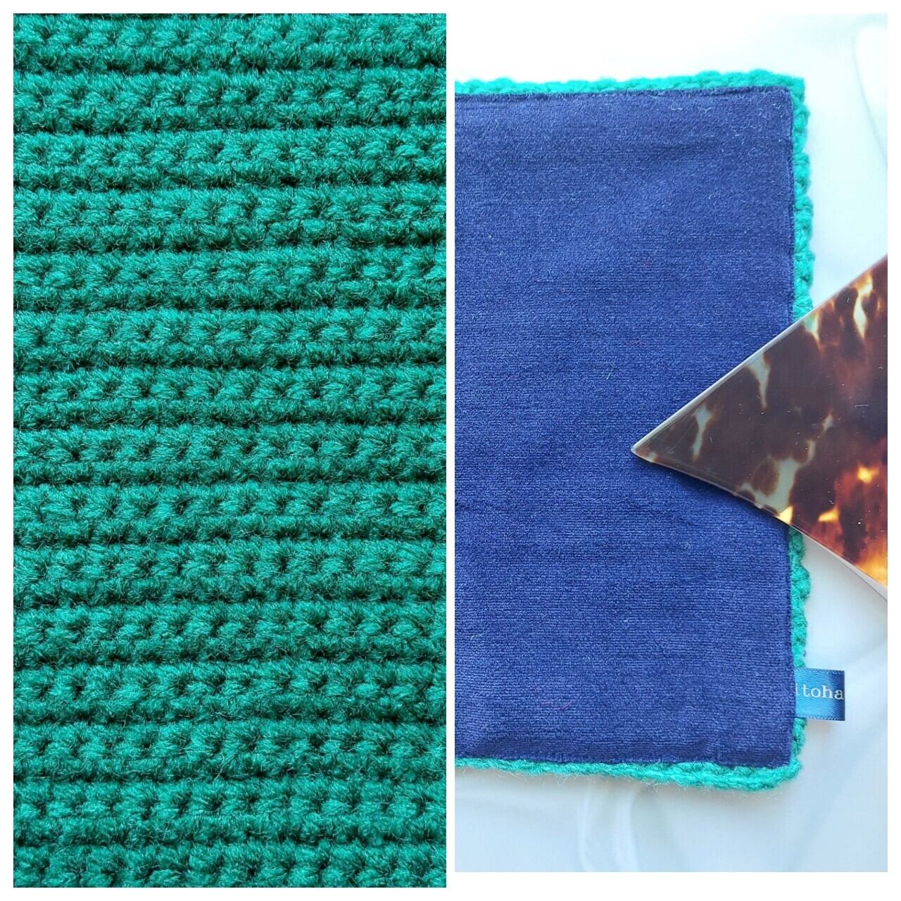「アクリルたわしで家中ピカピカ!」アクリル毛糸で編む洗剤いらずのエコ・タワシは長年の愛用者も多いのでは。アクリルの繊維の性質により、水なしでも洗浄力を発揮する魔法のたわし。それなら三味線もピカピカになるはず!!」と思い、試作・試用を重ね、摩擦熱が起きるくらいのイメージとパワーで棹を拭くと、くすんだ木肌がピカピカに!!!プロ奏者のお師匠先生にも思いのほか気に入って頂けました!!・・・が、撥のべっ甲はやはり従来のクロスでないと逆にくすむことも分かりました。それならばと<リバーシブル>にして商品化したのがこちらのクロスです。大きさは従来のクロス(セリート・艶ふきん等)の四分の一(約19.5㎝×18㎝/手編みですので若干の差異はご了承下さい)。クロスを二つ畳んだ大きさで使い勝手よく、厚みも磨きあげるには程良い厚みかと思います。