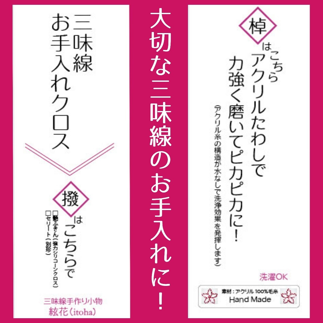 お好きな色味のリバーシブルクロスで分けて磨けば、大切な三味線と撥をいつもピカピカにお使い頂けます。