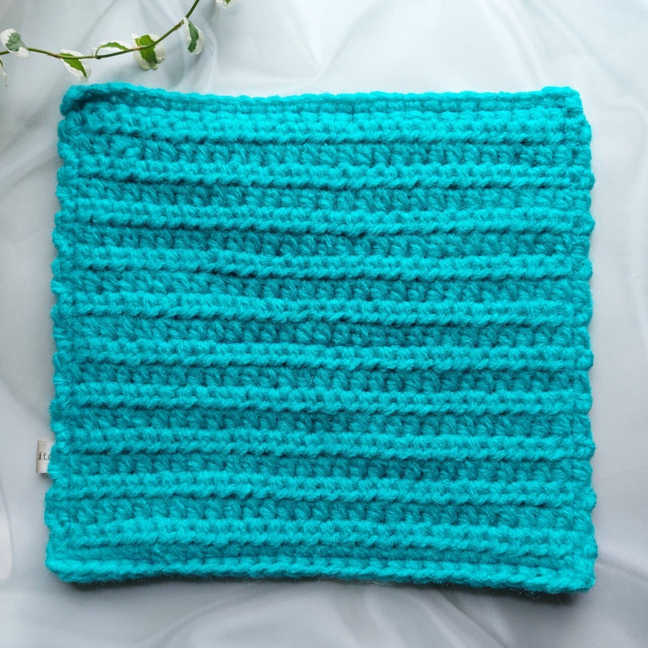 アクリル毛糸で編む洗剤いらずのエコ・タワシはアクリルの繊維の性質により、水なしでも洗浄力を発揮する魔法のたわし。「それなら三味線もピカピカになるはず!!」と四角に編みました。